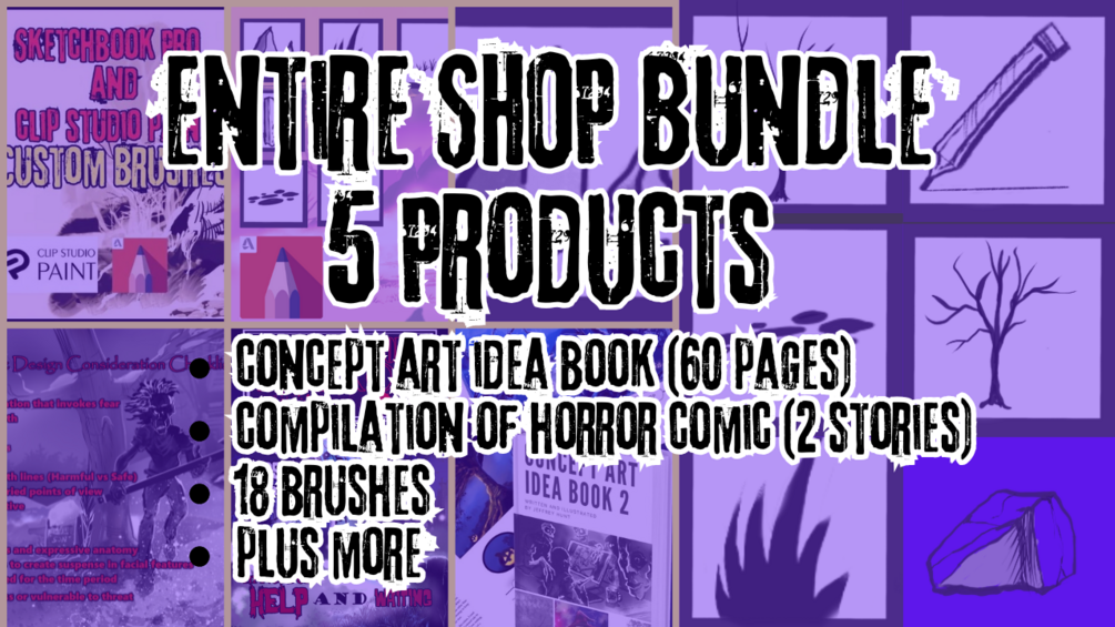 Both sets of Custom Brushes, the Concept Art Idea Book 2, and Compilation of Horror, and a Horror Design Checklist